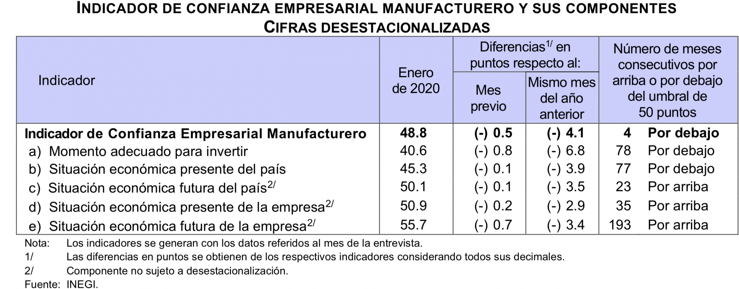 De acuerdo con un comunicado, en su comparación mensual, el Indicador de Confianza Empresarial Manufacturero se estableció en 48.8 puntos durante enero de 2020, nivel inferior en 0.5 puntos respecto al del mes precedente, según series desestacionalizadas.