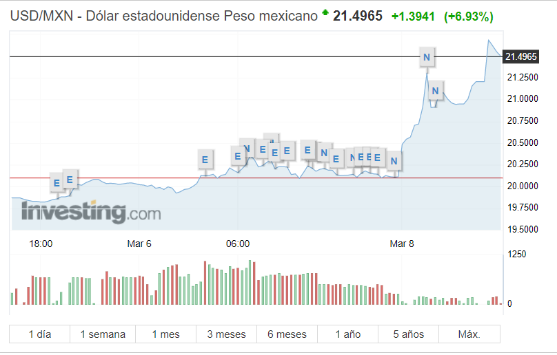 El dólar interbancario se cotizó hasta en 21.20 pesos, luego de que Arabia Saudita informara que aumentará su producción de petróleo en abril