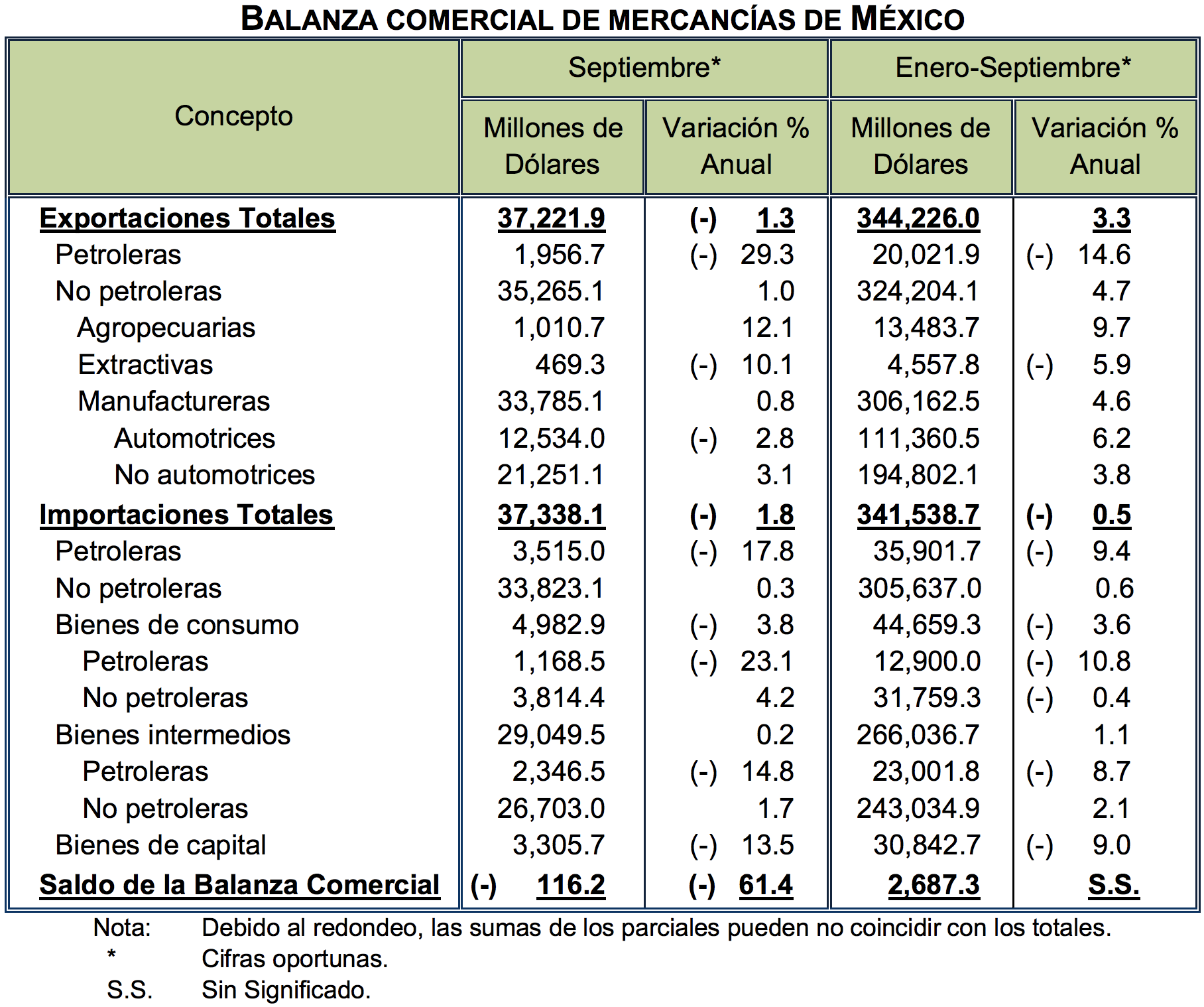 A través de un comunicado, el INEGI reportó que el valor de las exportaciones de mercancías en el noveno mes de este año fue de 37 mil 222 millones de dólares, cifra que se integró por 35 mil 265 millones de dólares de exportaciones no petroleras y por mil 957 millones de dólares de petroleras.