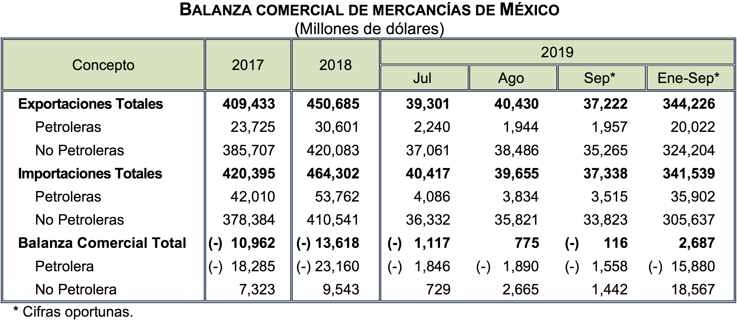 La información oportuna de comercio exterior de septiembre de 2019 indica un déficit comercial de 116 millones de dólares, saldo que se compara con el de 301 millones de dólares observado en igual mes de 2018.