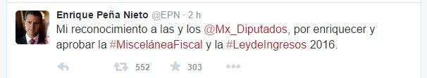 “Mi reconocimiento a las y los @Mx_Diputados, por enriquecer y aprobar la #MisceláneaFiscal y la #LeydeIngresos 2016”, escribió el titular del Ejecutivo federal en su cuenta de Twitter @EPN.