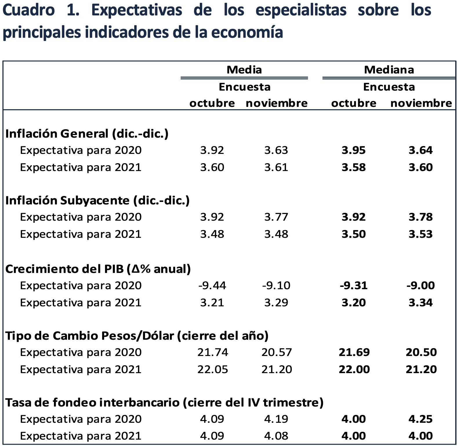 El consenso de especialistas consultados por el Banco de México (Banxico) mejoró, durante noviembre, el pronóstico de caída del país para 2020, estimándolo en menos 9.10 por ciento.