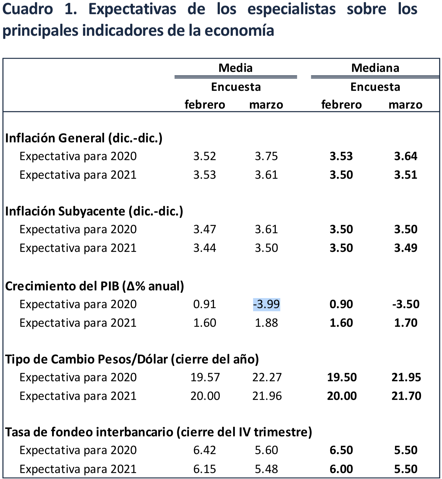 Especialistas consultados por el Banco de México (Banxico) recortaron drásticamente el pronóstico de crecimiento del país para 2020, pasando del 1.00 por ciento estimado en febrero de 2020 al -3.99 por ciento en marzo.