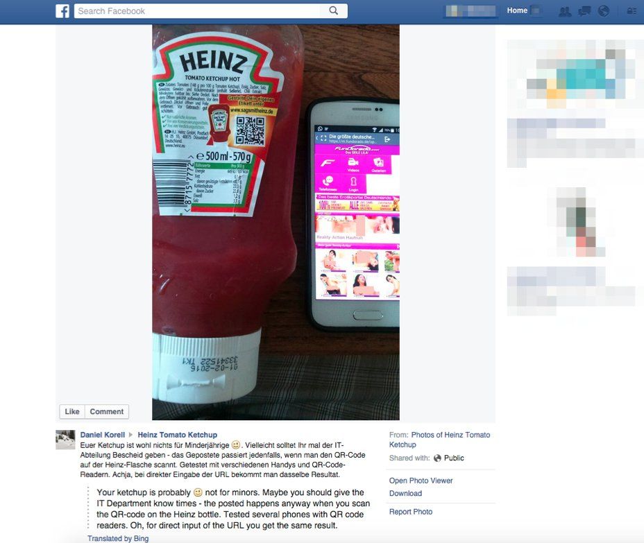 En Alemania, un hombre compró una botella de cátsup Heinz y al escanear el código QR del producto, que debería llevarlo a un sitio web en donde él podría diseñar su propia etiqueta de salsa de tomate, acabó en un sitio pornográfico.