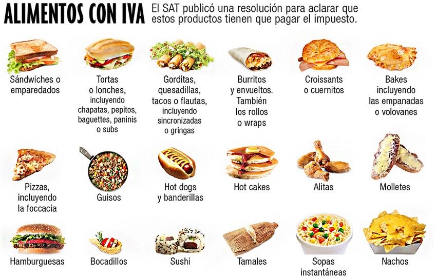 Esta es la lista de alimentos preparados a los que a partir de este 1 de julio se les cobrará el 16 por ciento de IVA: sándwiches o emparedados; tortas, lonches, chapatas, pepitos, baguettes, paninis o subs;  gorditas, quesadillas, tacos o flautas, sincronizadas, gringas; burritos y envueltos, rollos, wraps; croissants, bakes, empanadas o volovanes; pizzas, focaccia; hot dogs y banderillas; hot cakes; alitas, molletes, hamburguesas, bocadillos, sushi, tamales, sopas instantáneas y nachos.