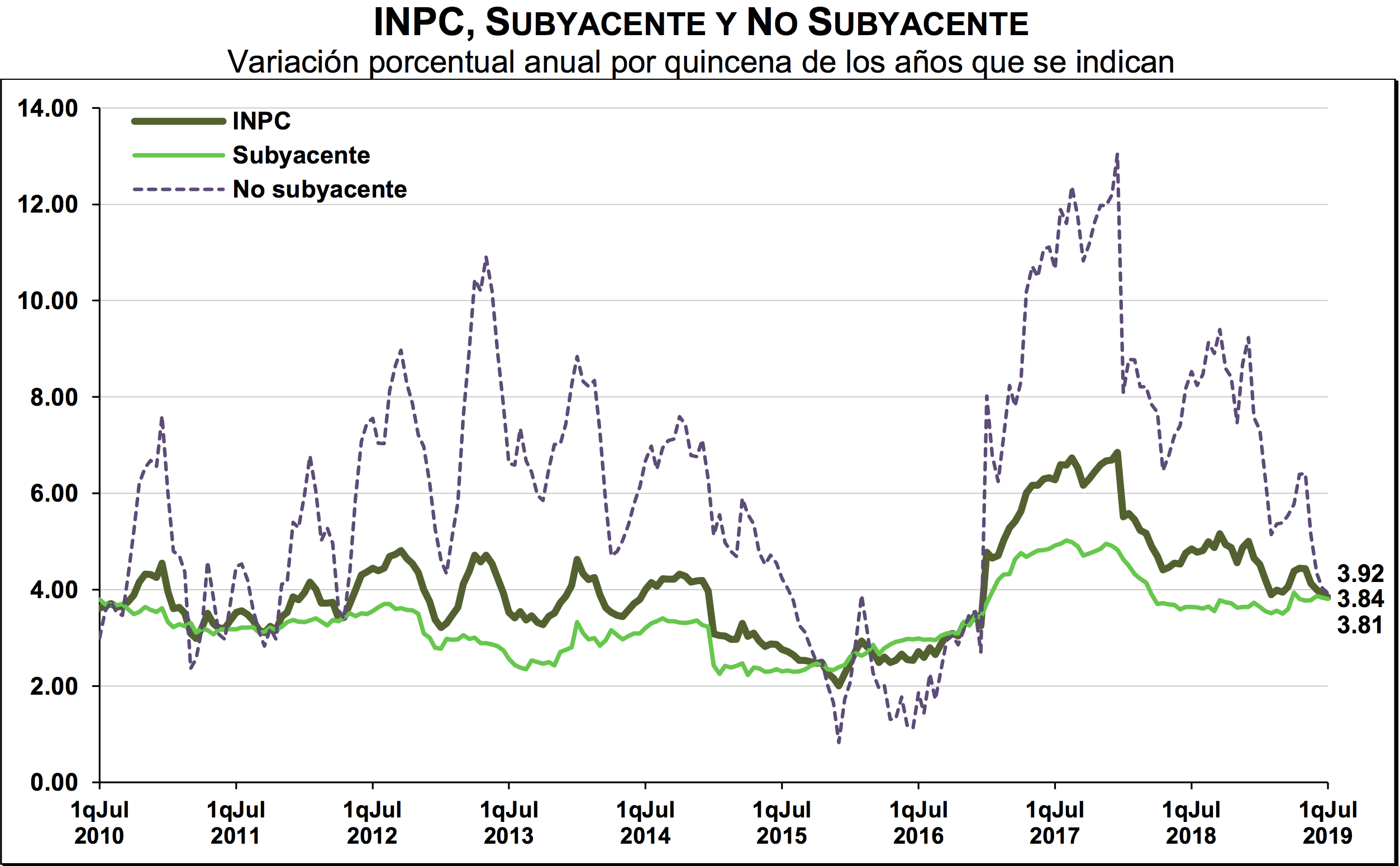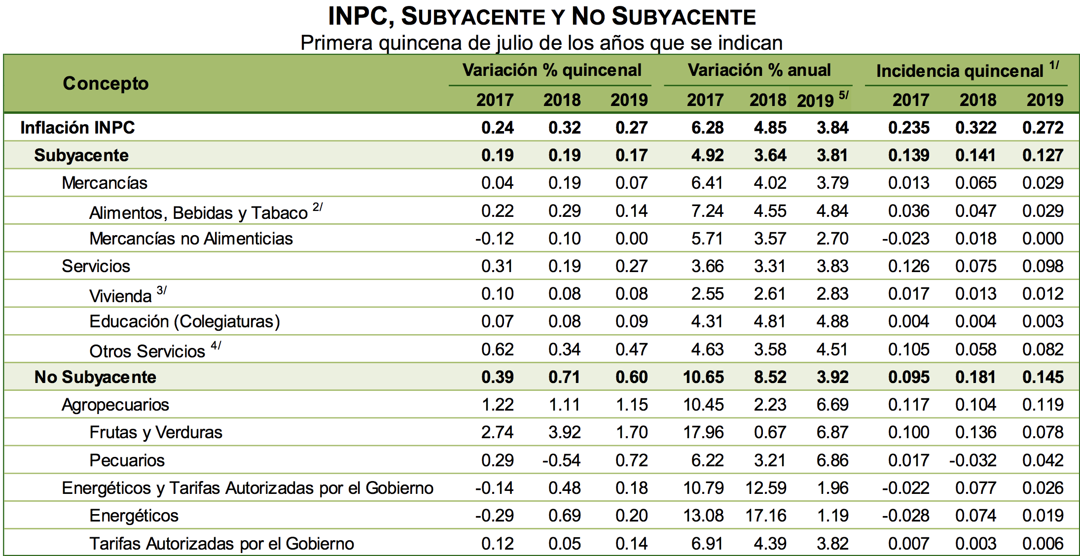 La variación en la primera quincena de julio de los índices subyacente y no subyacente fue de 0.17 y de 0.60 por ciento, respectivamente. Los datos comparables para el mismo periodo de 2018 muestran incrementos de 0.19 y de 0.71 por ciento.