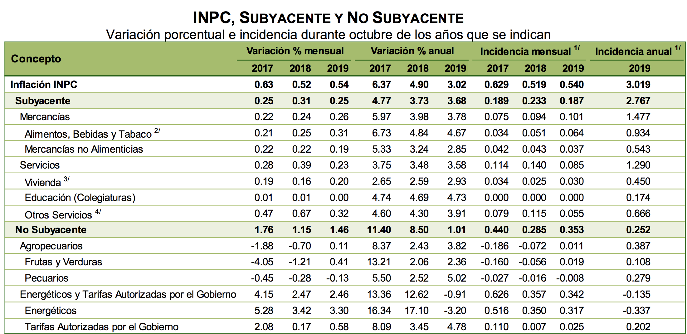 Inflación de México baja a 3.02% durante octubre y mantiene meta de Banxico - inpc-subyacente-y-no-subyacente-variacion-porcentual-e-incidencia-durante-octubre-de-los-anos-que-se-indican