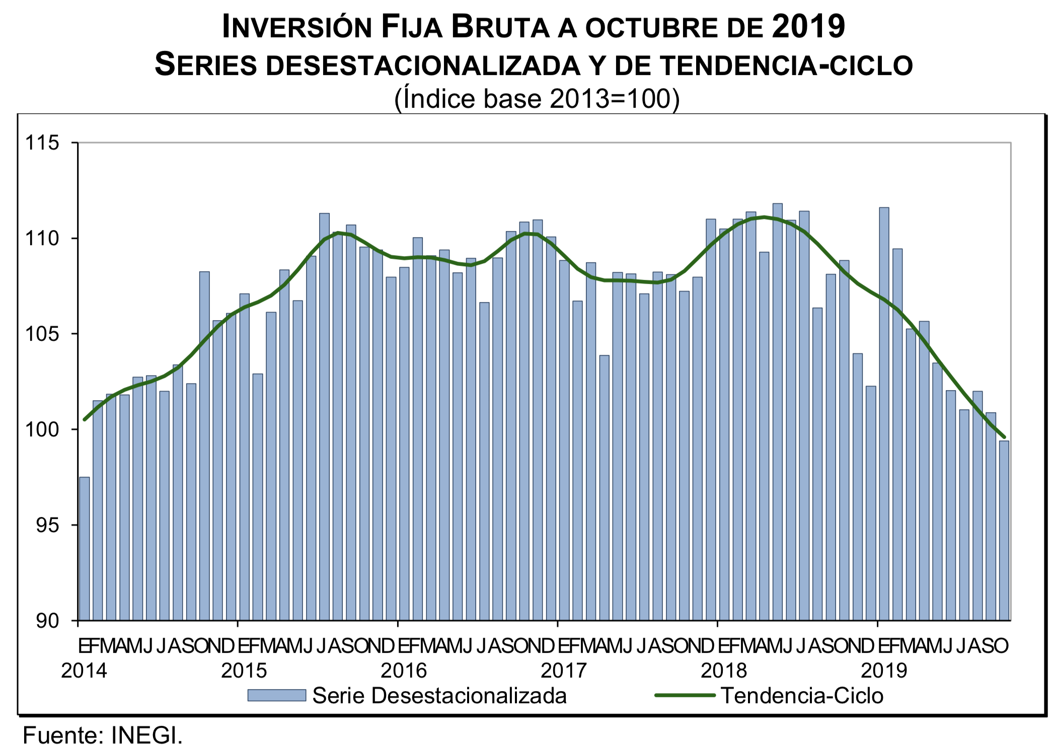 La inversión fija bruta vuelve a caer durante octubre pasado, al caer 8.7 por ciento frente a igual periodo de 2018, informó el INEGI