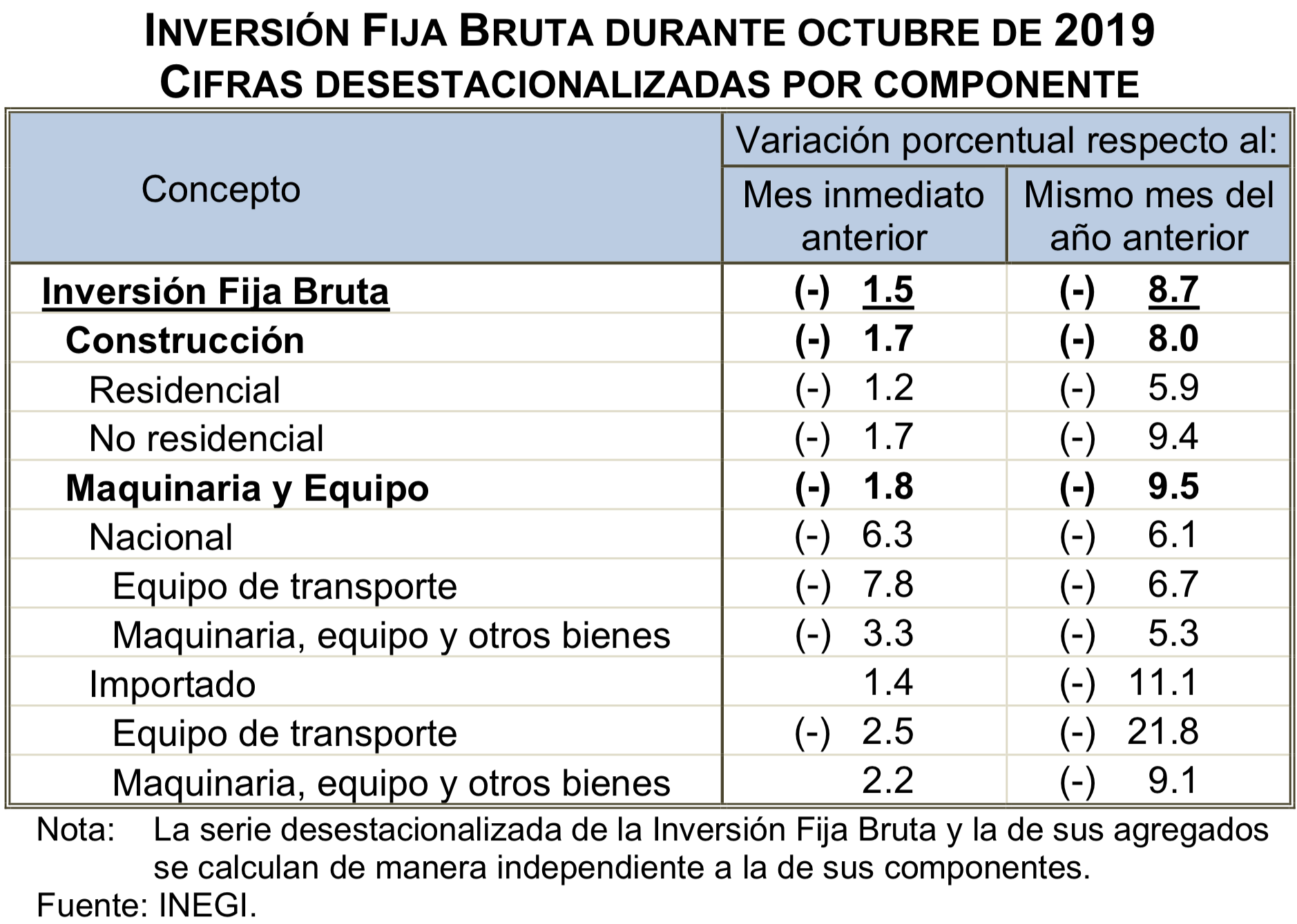 La inversión fija bruta volvió a mostrar una variación negativa durante octubre pasado, al caer 8.7 por ciento frente a igual periodo de 2018, informó el Instituto Nacional de Estadística y Geografía (INEGI).