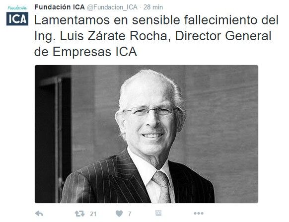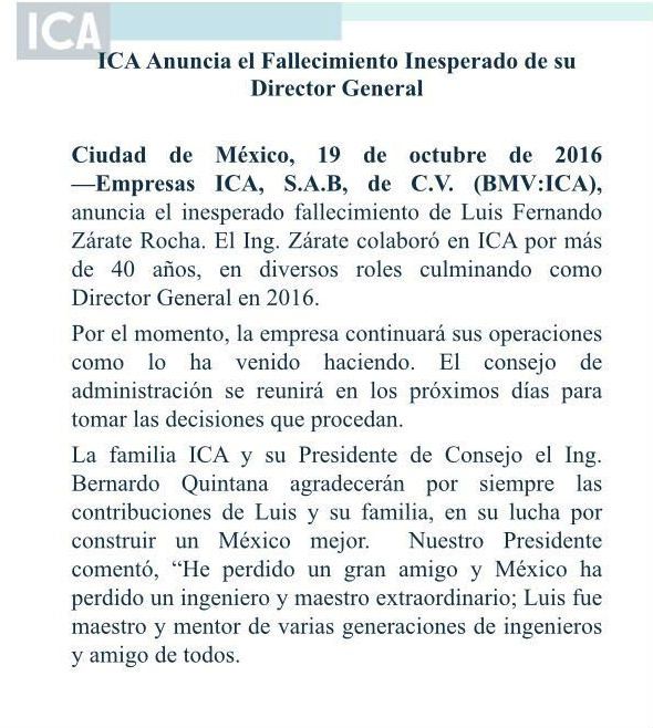 Por su parte, ICA confirmó el deceso en un comunicado donde el presidente del consejo de administración de ICA lamentó la muerte de una persona que consideraba muy cercana.