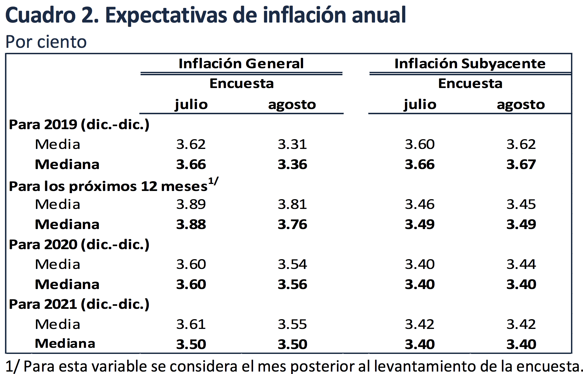 Las expectativas de inflación subyacente para los cierres de 2019 y 2020, de acuerdo con especialistas, permanecieron en niveles cercanos a los del mes anterior.