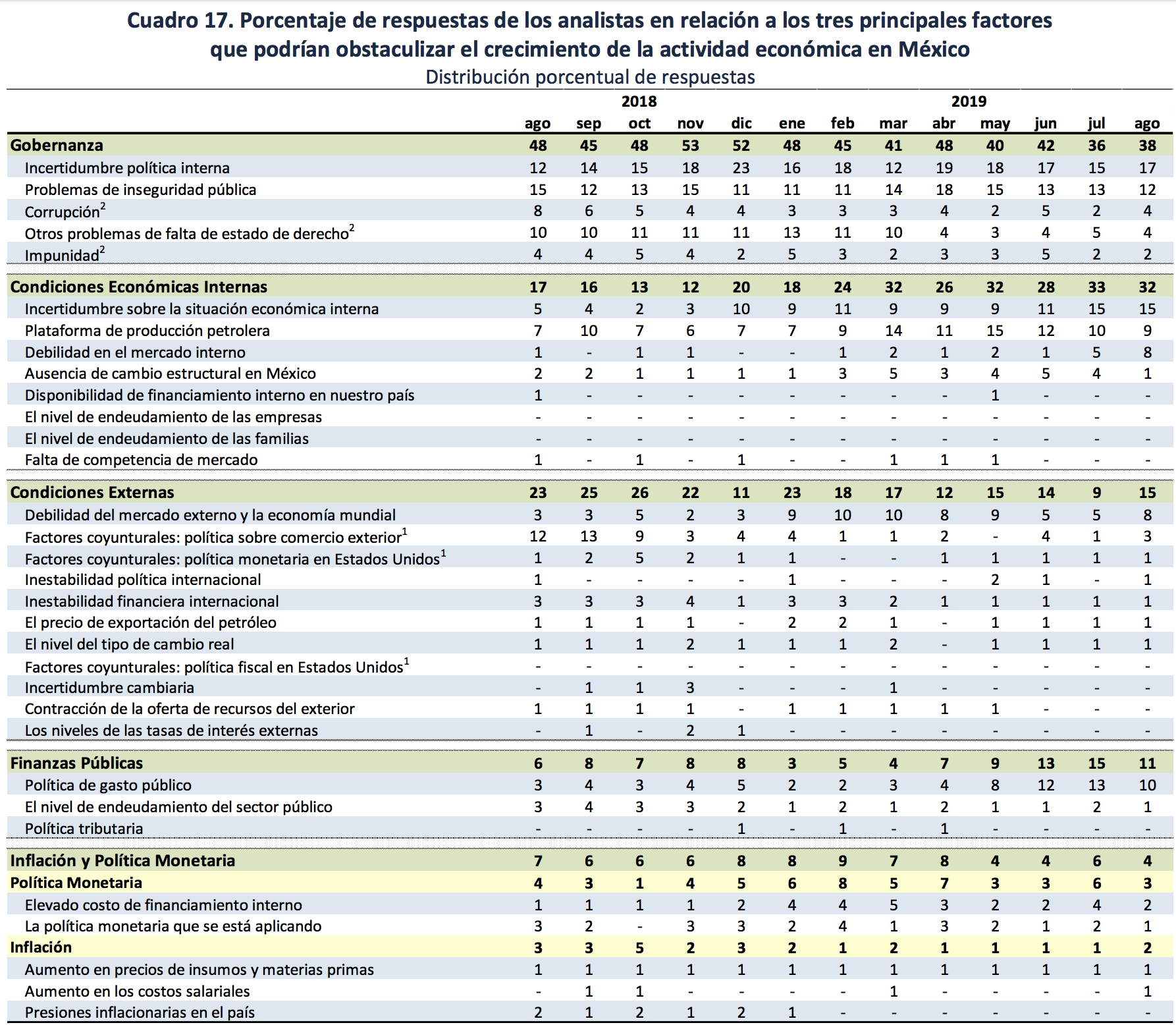 A nivel particular, los principales factores son, en orden de importancia: la incertidumbre política interna (17 por ciento de las respuestas); la incertidumbre sobre la situación económica interna (15 por ciento de las respuestas); los problemas de inseguridad pública (12 por ciento de las respuestas); la política de gasto público (10 por ciento de las respuestas); y la plataforma de producción petrolera (9 por ciento de las respuestas)