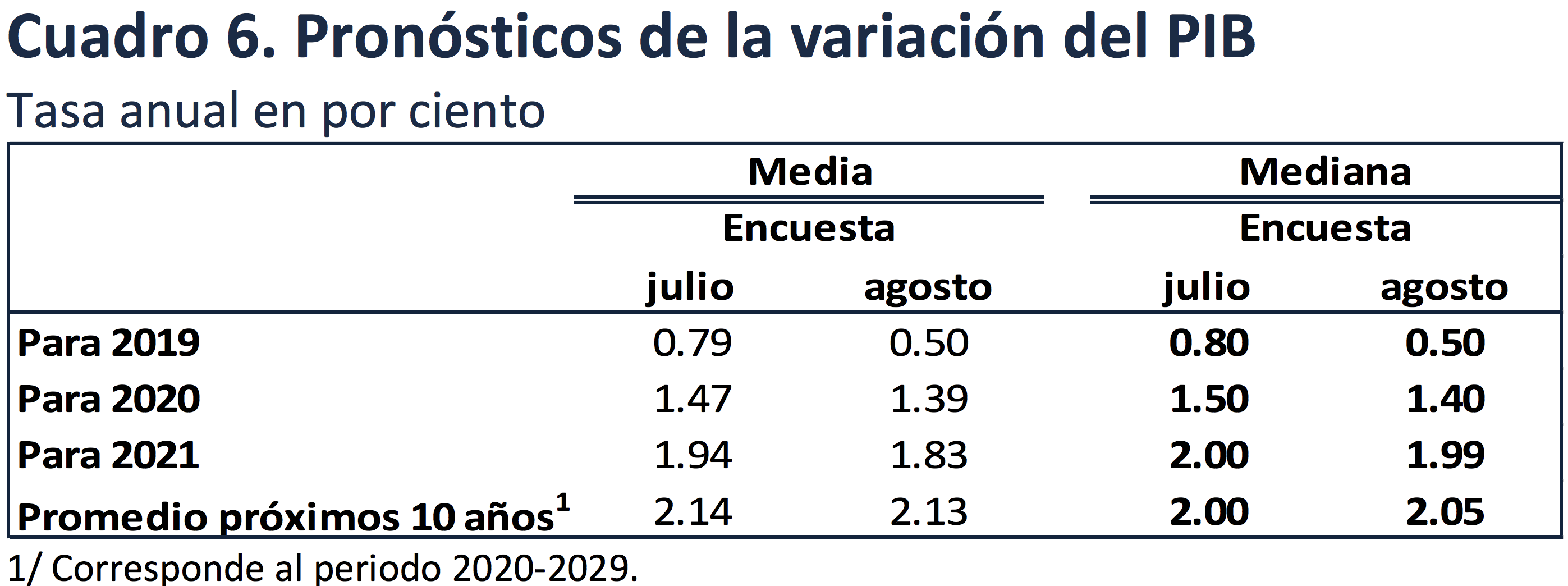 El consenso de especialistas de Banxico recortó nuevamente el pronóstico de crecimiento para 2019; pasando del 0.79 por ciento en julio a 0.50 por ciento para agosto