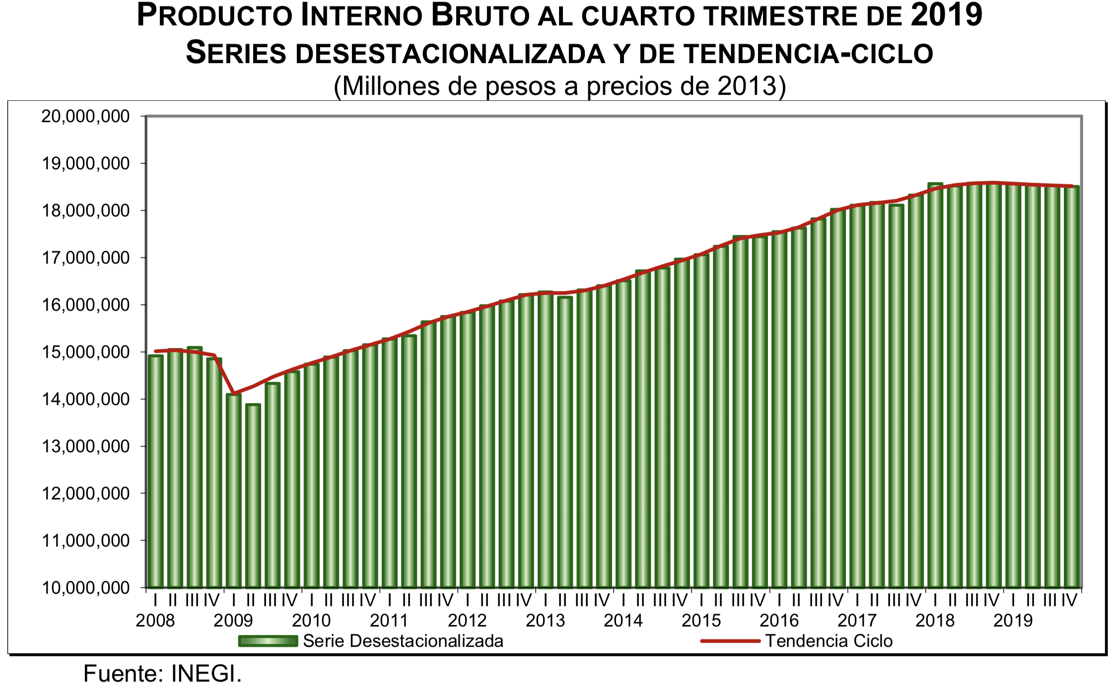 El Inegi señaló que los resultados del PIB registraron una disminución de 0.1 por ciento en términos reales, en el trimestre octubre-diciembre de 2019 frente al trimestre previo, con cifras ajustadas por estacionalidad.