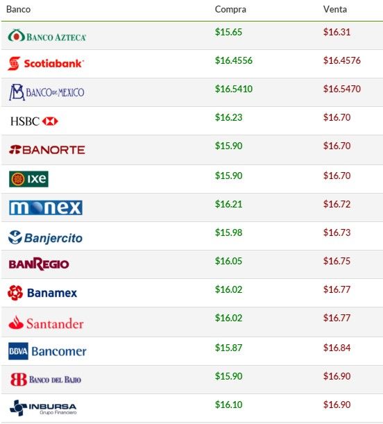 La institución financiera estima que para este día el tipo de cambio oscile entre 16.50 y 16.56 pesos por dólar.