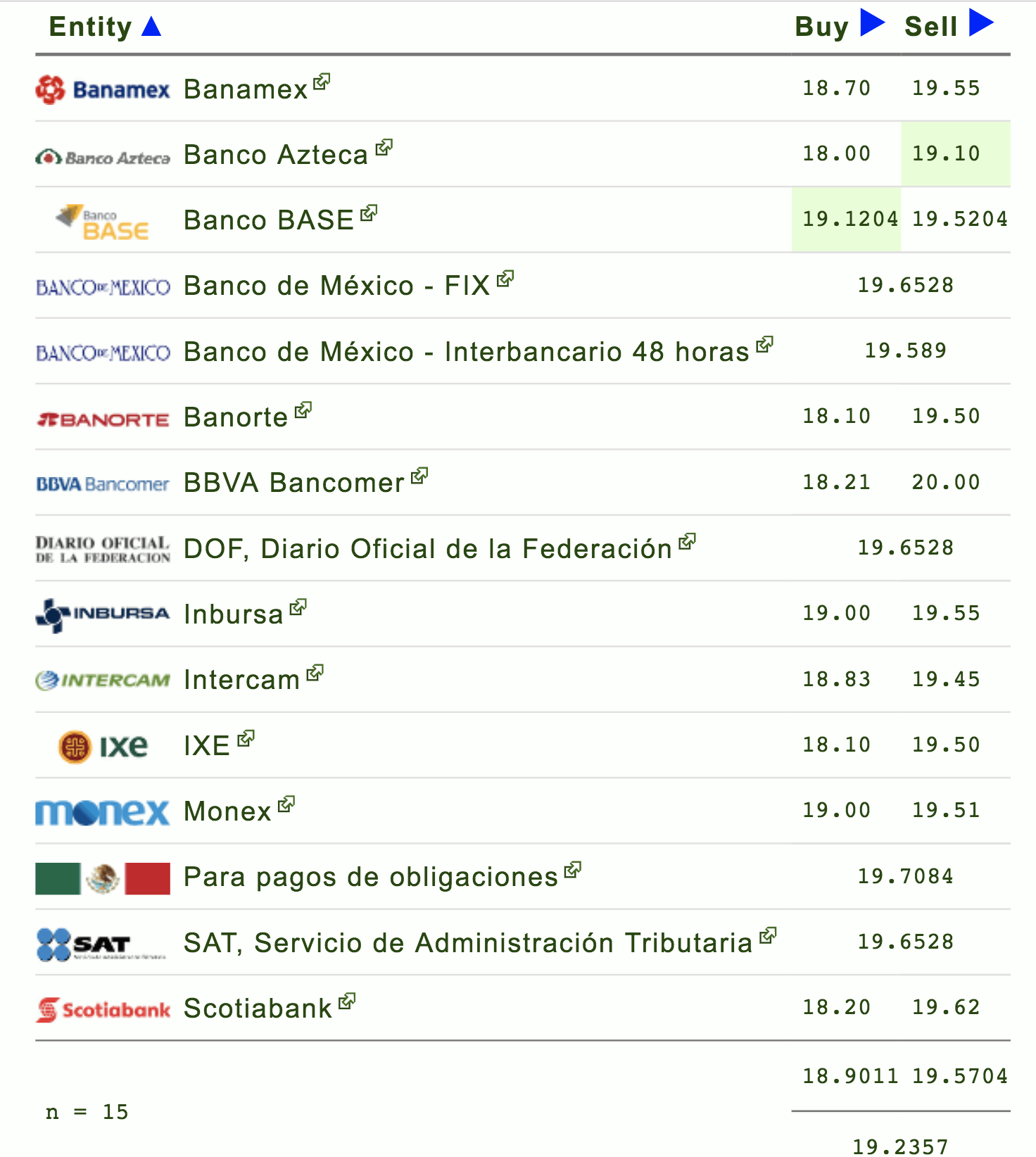 Esta mañana, el dólar se vende en un precio máximo de 19.55 pesos y se adquiere en un mínimo de 18.00 pesos en ventanillas bancarias de la Ciudad de México.