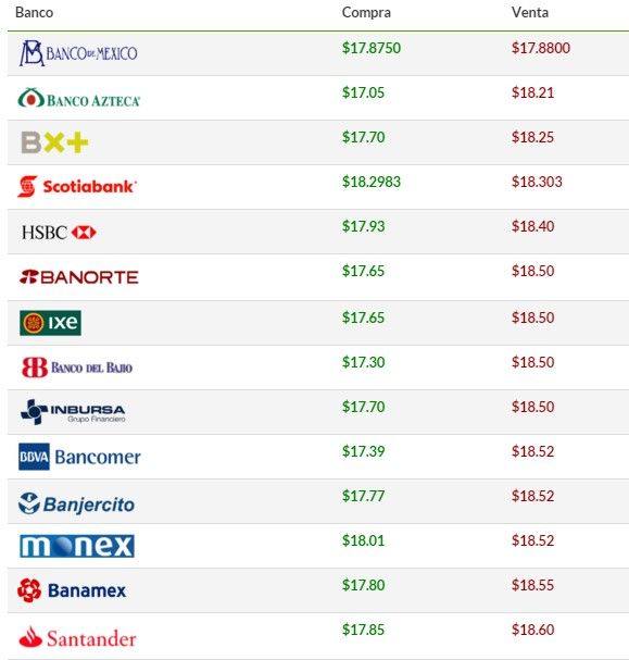 Instituciones bancarias de la Ciudad de México ofrecen el dólar libre hasta en 18.60 pesos, y lo compran en un mínimo de 17.39 pesos por unidad.