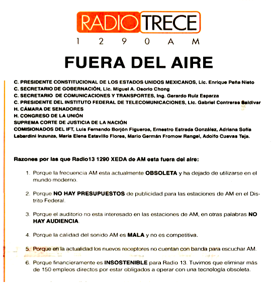 Aunque era una noticia que ya se esperaba desde hacía semanas, es el día de hoy que la estación Radio 13, en el 1290 de la frecuencia AM, anuncia oficialmente su salida del aire.
