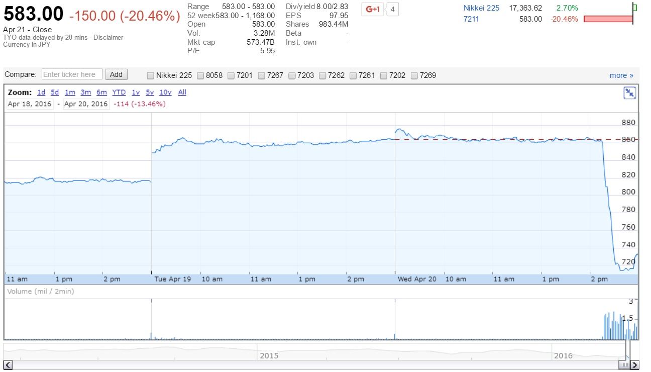 La caída más fuerte se dio el día de ayer cuando el valor de las acciones se desplomó en un 15 por ciento y luego descendió al 20.46 por ciento en el día de hoy alcanzando los 583 yenes, el equivalente a una pérdida de 150 yenes que se ubica como el retroceso máximo autorizado en un día.