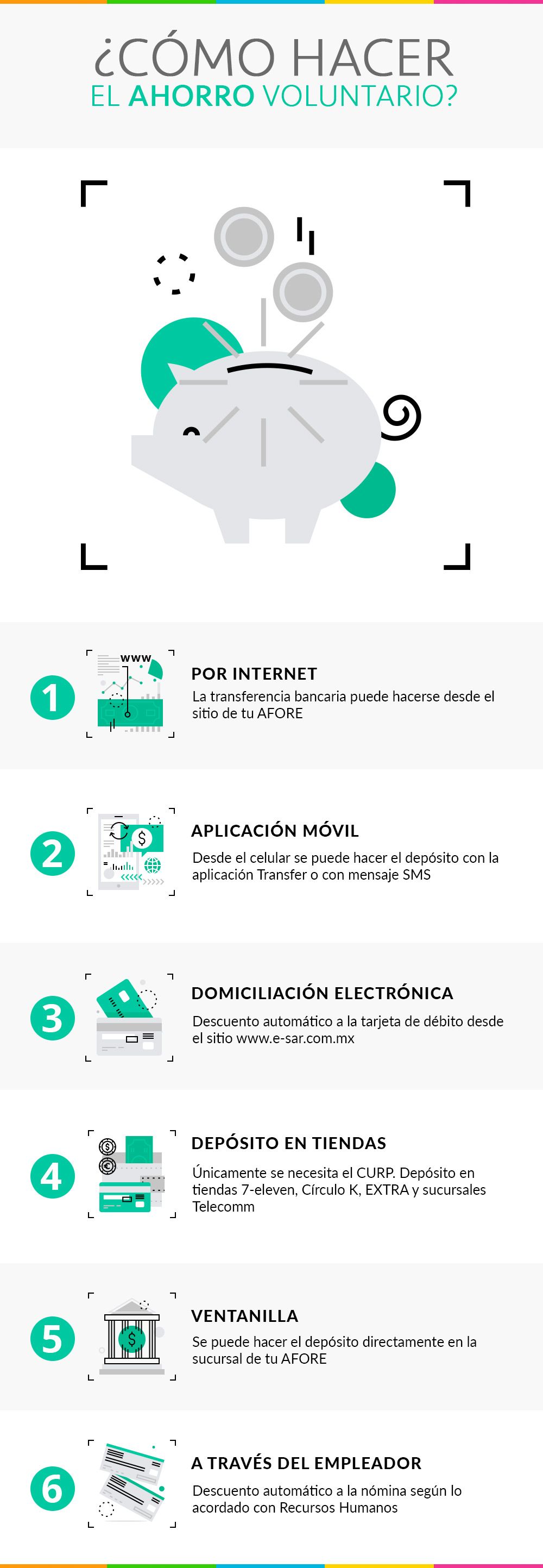 Por tal motivo, la CONSAR pone a la disposición de la población seis opciones para realizar el ahorro voluntario en el AFORE.