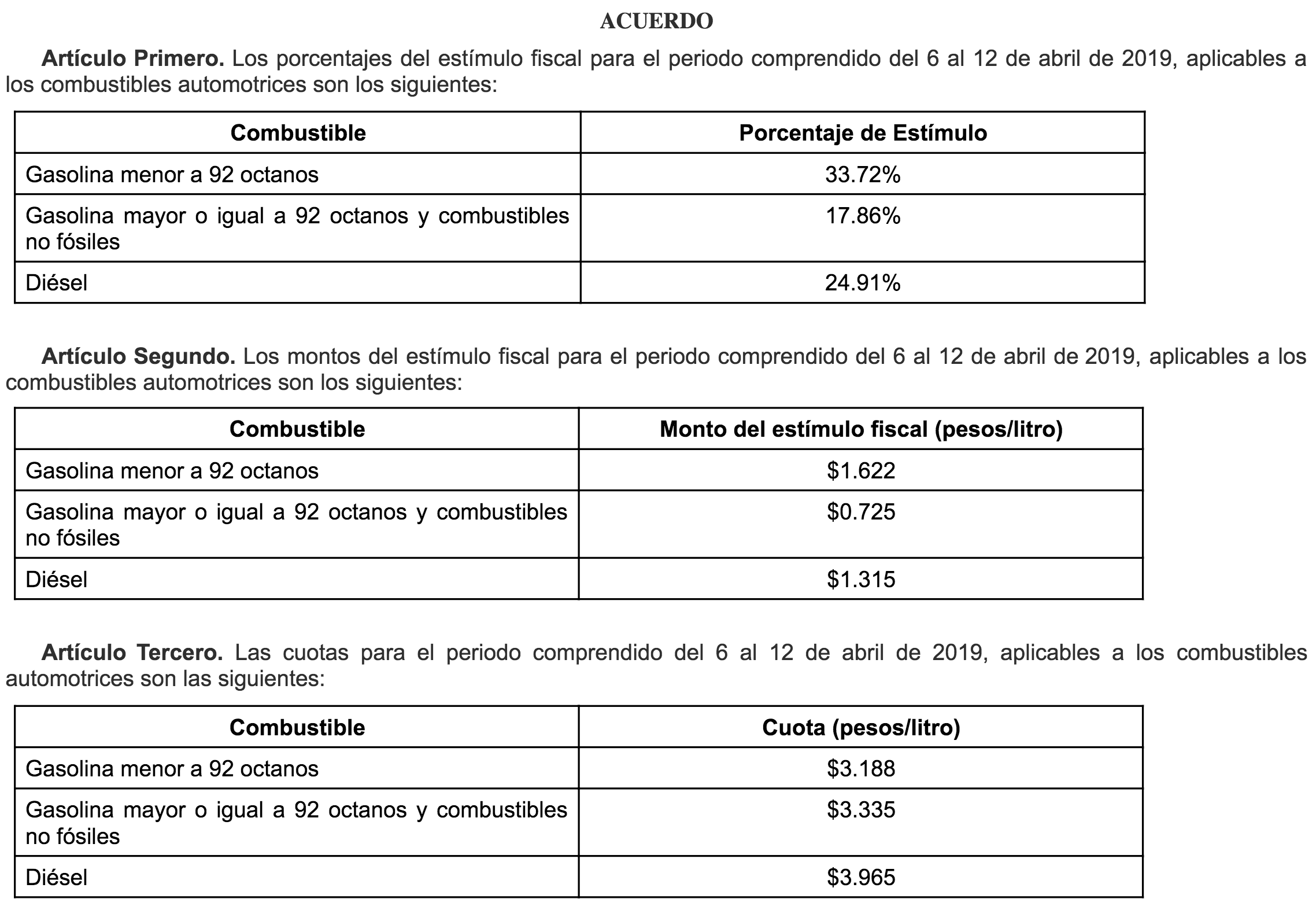 Esto fue anunciado en el Diario Oficial de la Federación, en donde los porcentajes del estímulo fiscal para el periodo comprendido del 6 al 12 de abril de 2019, aplicables a los combustibles automotrices, son los siguientes: