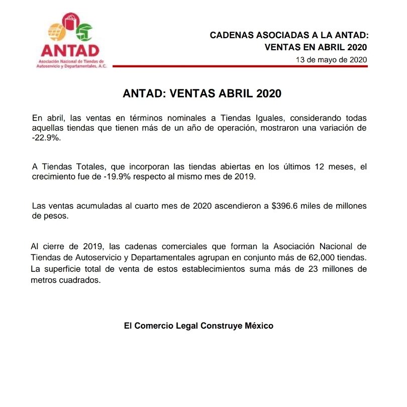 La Asociación Nacional de Tiendas de Autoservicios y Departamentales (ANTAD) informó que durante abril de 2020, las ventas en términos nominales a ‘Tiendas Iguales‘, considerando a todas las que llevan al menos un año de operación, mostraron una variación del menos (-)22.9 por ciento.