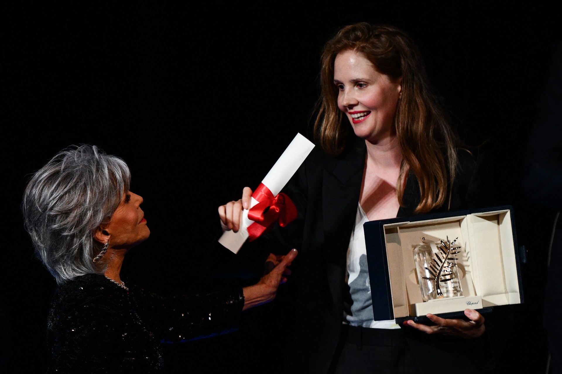 Todo el equipo de este film -que trata sobre el caso de un hombre que muere al caerse por la ventana en su casa en las montañas, en un momento en el que solo estaban en ella su mujer, su hijo ciego y su perro- subió al escenario para recoger el galardón, que se había encargado de anunciar la actriz estadounidense Jane Fonda.
