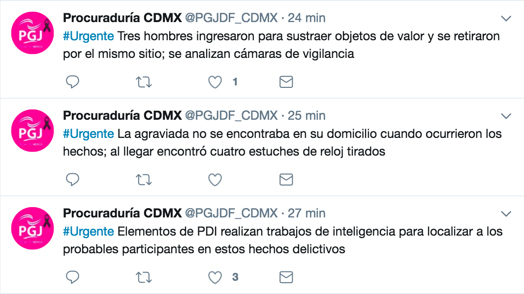 A través de su cuenta de Twitter, la Procuraduría escribió lo siguiente: ” #Urgente La #PGJCDMX investiga el robo a casa habitación cometido en agravio de una conductora y actriz, la madrugada del domingo”.