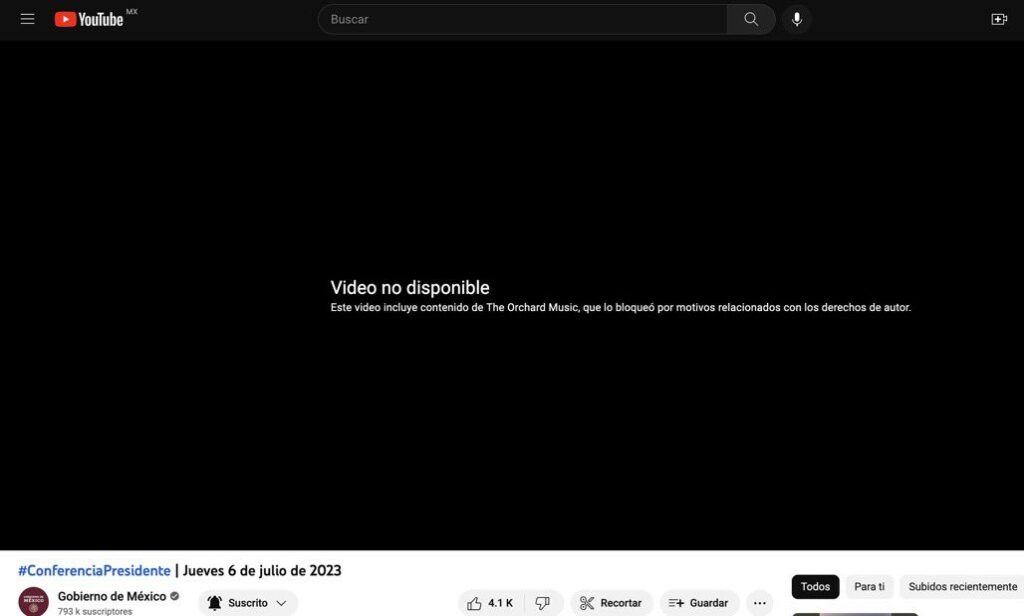 “Video no disponible. Este video incluye contenido de The Orchard Music, que lo bloqueó por motivos relacionados con los derechos de autor”, se muestra al intentar reproducir la grabación de la mañanera de este jueves.