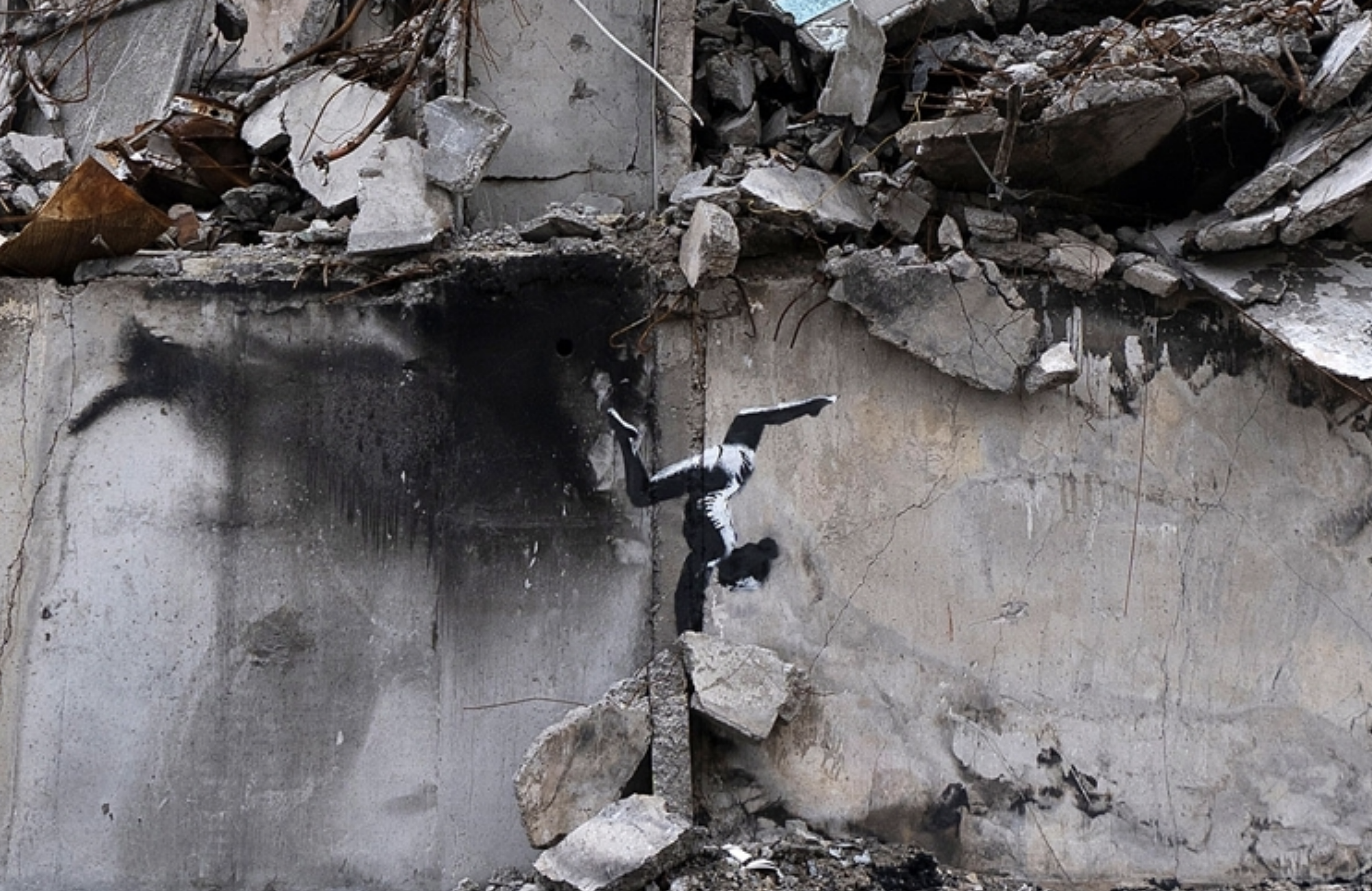 El enigmático y reivindicativo artista británico Banksy ha plasmado uno de sus grafiti sobre la pared de un edificio en ruinas de la ciudad ucraniana de Borodyanka, en el extrarradio de Kiev, informa el portal Ukrinform.