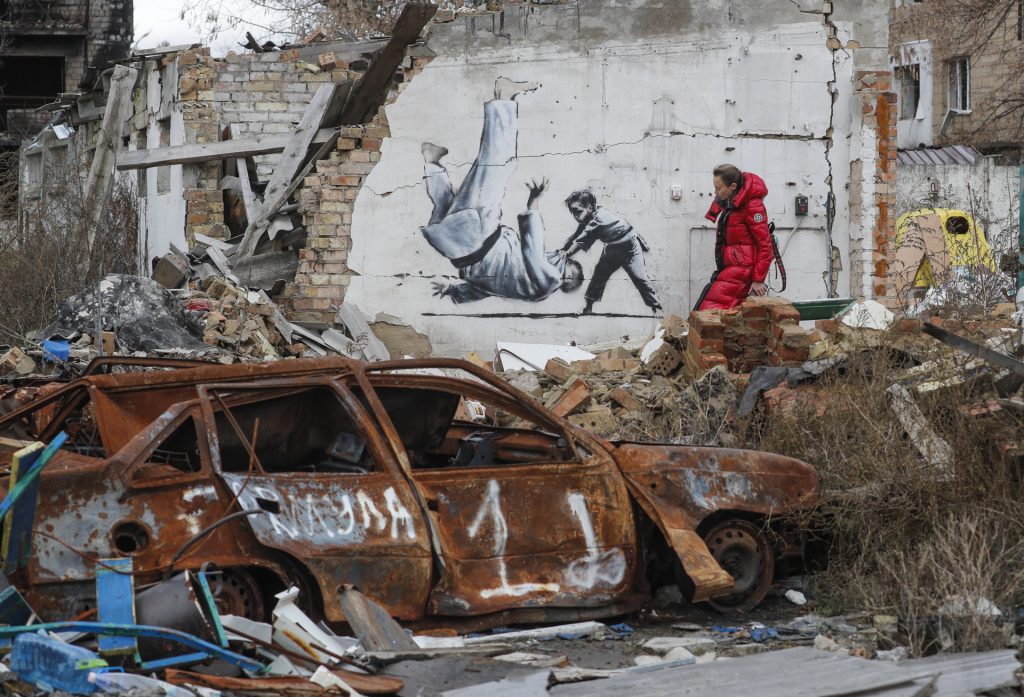 La primera obra en Ucrania del reivindicativo artista apareció el pasado 12 de noviembre. Se trató de un grafiti sobre la pared de un edificio en ruinas de la ciudad ucraniana de Borodyanka, en el extrarradio de Kiev.