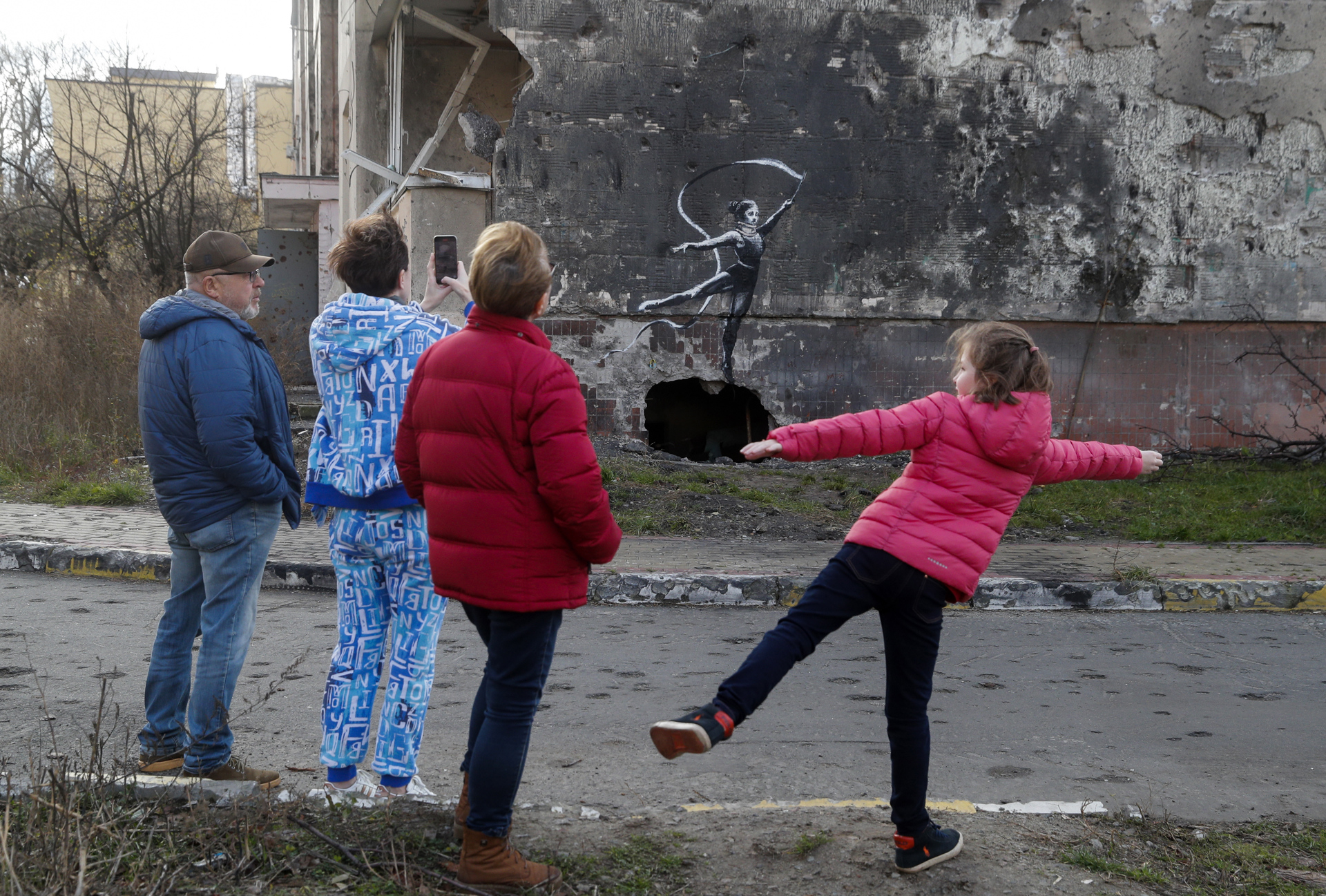 Otro mural muestra a dos niños usando como balancín una de las trampas de metal que se emplean para detener a los tanques, mientras que en un tercer mural, pintado dentro de las ruinas de un edificio bombardeado, aparece una gimnasta haciendo un ejercicio de cabeza, explico The Art Newspaper.