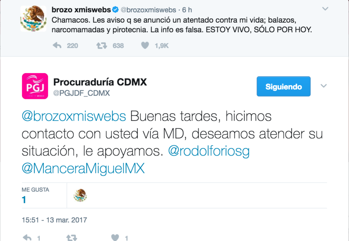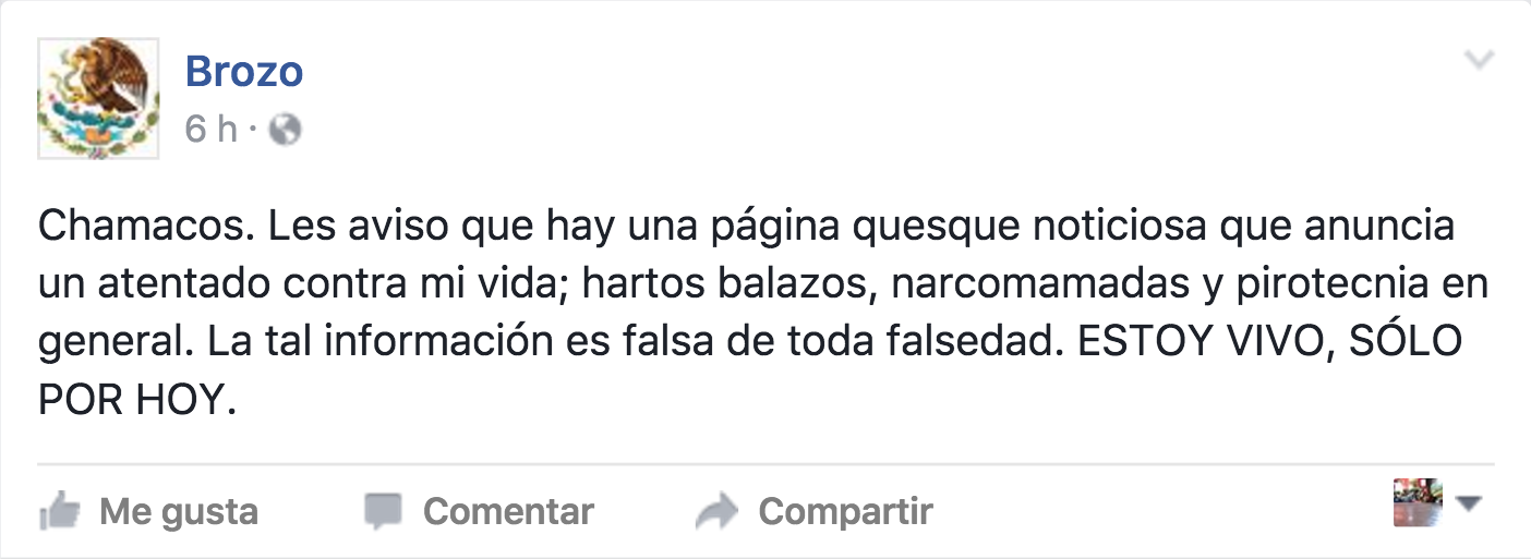 Por su parte, en Twitter escribió: “Chamacos. Les aviso q se anunció un atentado contra mi vida; balazos, narcomamadas y pirotecnia. La info es falsa. ESTOY VIVO, SÓLO POR HOY”.
