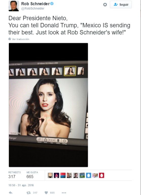 “Estimado Presidente Nieto, puede decirle a Donald Trump, “México ESTÁ enviando lo mejor. Solo mira a la esposa de Rob Schneider!”, señala en su publicación, acompañada de una foto de su esposa Patricia.