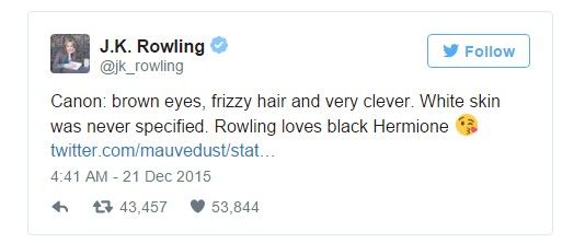 “El canon es: ojos cafés, cabello encrespado y muy inteligente. La piel blanca nunca se especificó. A Rowling le encanta la Hermione negra”, escribió la autora mientras que agregó un emoji de un beso.