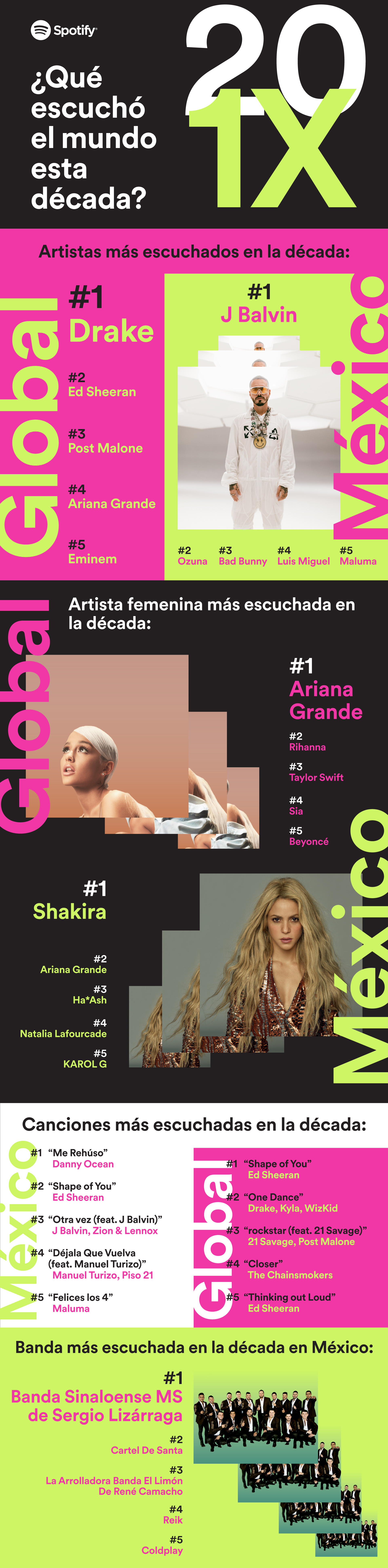 En este Top 5 de artistas la década en México, lo acompañan Ozuna, Bad Bunny, Luis Miguel, el artista mexicano más escuchado en el país, y Maluma.