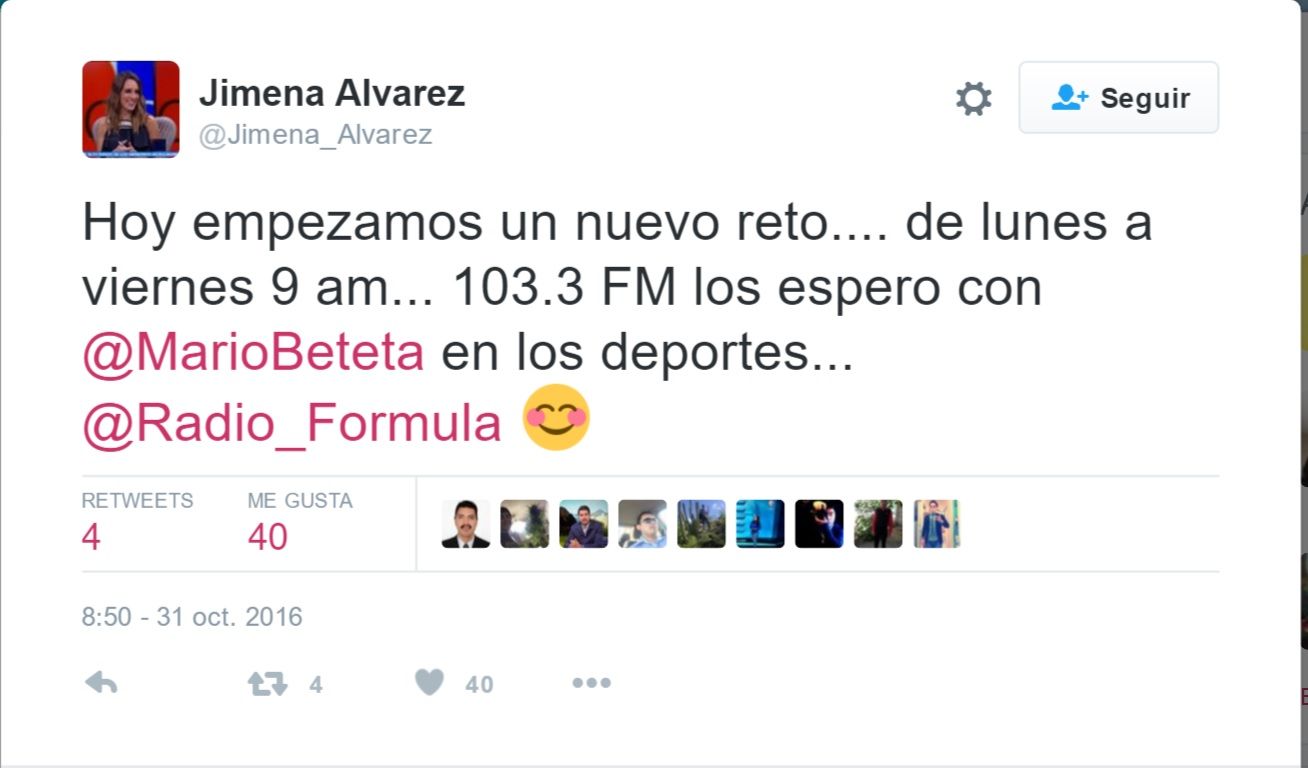 Así lo informó a través de su cuenta de Twitter, señalando que, desde el día de hoy, de lunes a viernes a las 9:00 h tendrá participación en la sección de deportes del noticiero “En Los Tiempos de la Radio” conducido por Óscar Mario Beteta.
