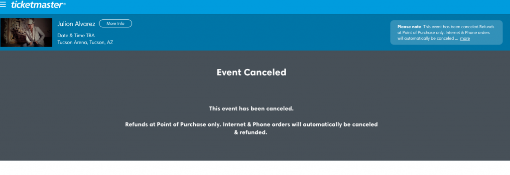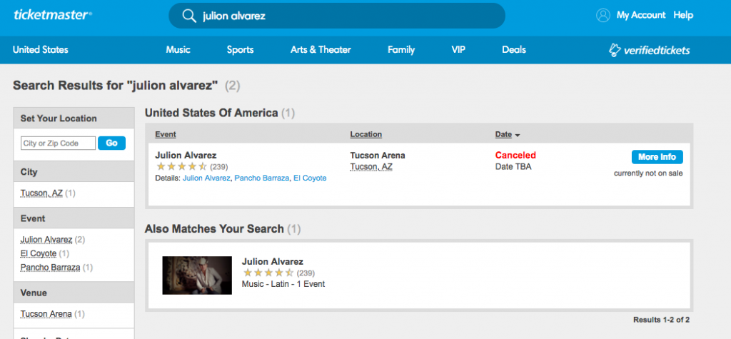 El concierto que el cantante Julión Álvarez realizaría en Tucson, Arizona, quedó cancelado luego de las acusaciones que hizo el Departamento del Tesoro en su contra al acusarlo de actuar como prestanombres de integrantes del crimen organizado.