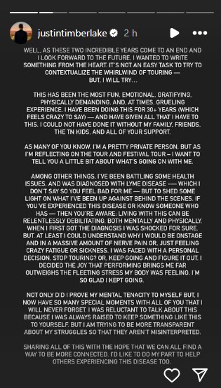 El cantante estadounidense Justin Timberlake reveló que padece la enfermedad de Lyme, que definió como “increíblemente extenuante”.