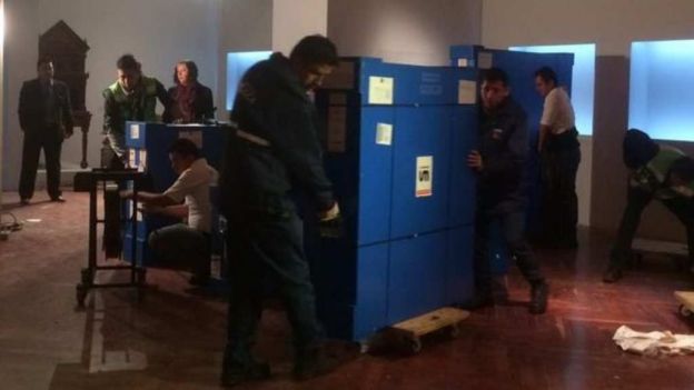 El traslado que inicio en Palacio de Bellas Artes fue vigilado por dos Comisarios, profesionales capacitados en el manejo y administración de este tipo de piezas. Ellos viajan junto con las obras y supervisan su desmontaje.