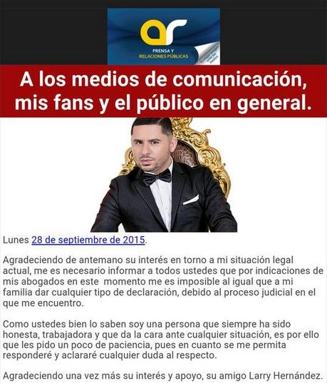 La tarde del lunes 28 de septiembre, a través de un comunicado de prensa publicado en la cuenta de Twitter @larryhernandez1, por la oficina de representación del cantante, Prensa y Relaciones Públicas, se agradece al público por la atención que han prestado en torno la situación legal y se ofrecen disculpas por no emitir comentarios del caso.