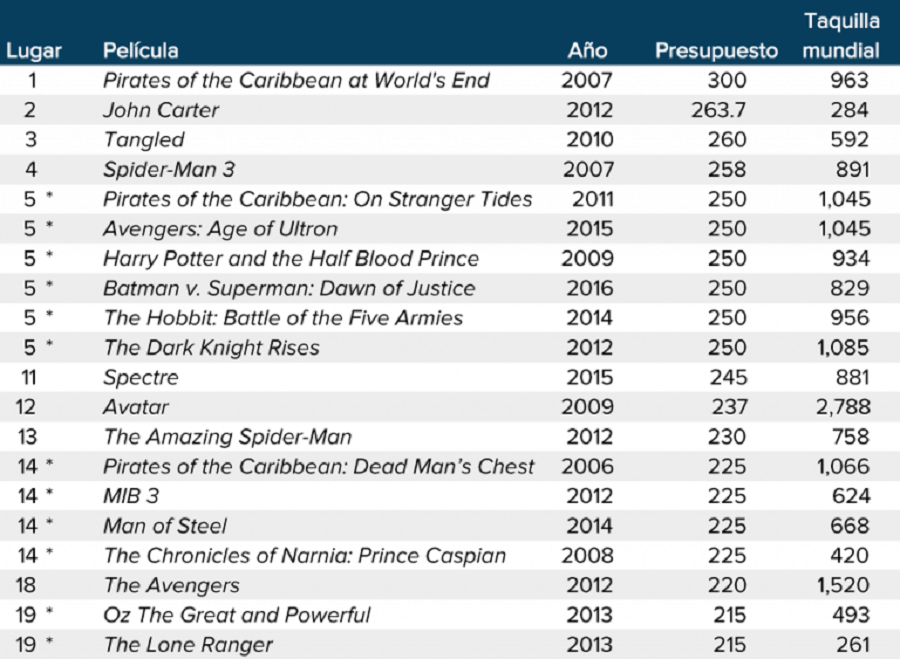 Así, la nueva oleada de películas de superhéroes y fantasía, dominan la lista de películas más caras, todas ellas superando los 200 millones de dólares.