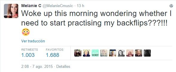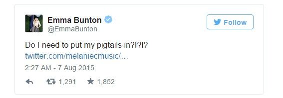 Por el contrario, Baby Spice (Emma Bunton) sí se ha mostrado entusiasmada con la posibilidad. En su cuenta de Twitter preguntó a sus fans: “¿Necesito ponerme mis coletas?”, respondiendo a su vez a Melanie C, que también pregunto a sus seguidores si necesitaría practicar sus característicos movimientos.
