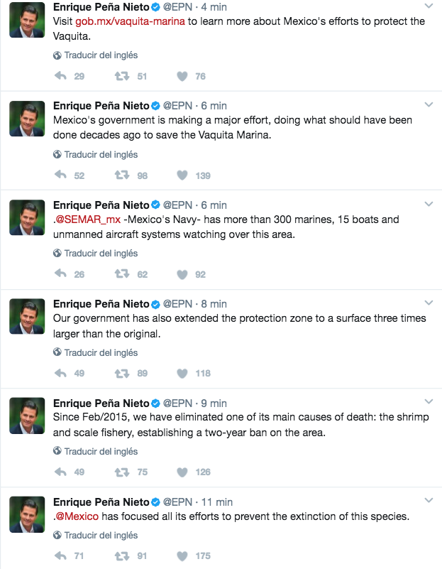 En siguientes tuits, invitó a la gente a visitar el sitio gob.mx/vaquita-marina “para aprender más sobre los esfuerzos de México para proteger a la Vaquita”.