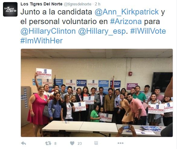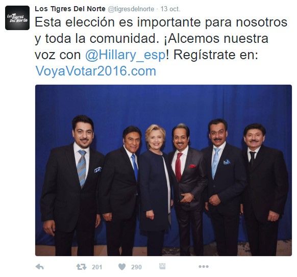 Los Tigres del Norte, una de las bandas musicales mexicanas más populares entre hispanos en Estados Unidos, hicieron hoy campaña a favor de Hillary Clinton mediante llamadas telefónicas y publicaciones en sus redes sociales.