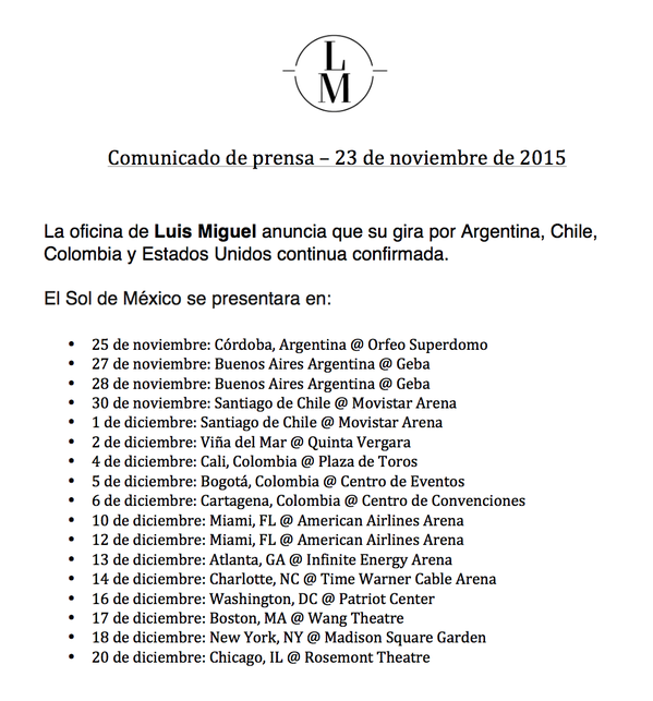 A continuación, el comunicado donde se confirman las fechas de las presentaciones de Luis Miguel.