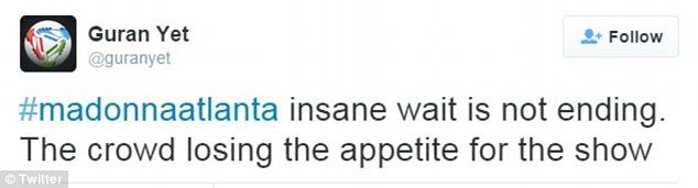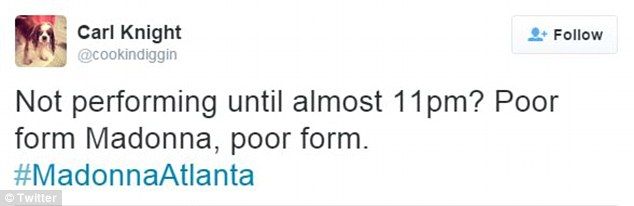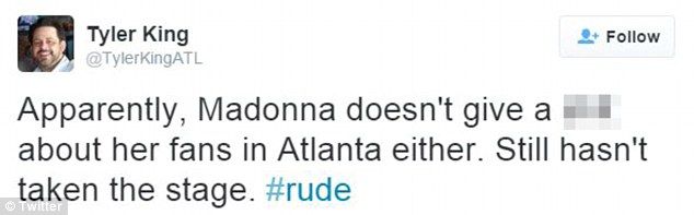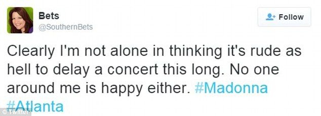 Este miércoles, Madonna tardó tres horas en presentarse en el Philips Arena en Atlanta, saliendo al escenario a las 23:00 h, causando que muchos fanáticos se fueran antes de tiempo para alcanzar el último tren de la noche que los llevara a casa.