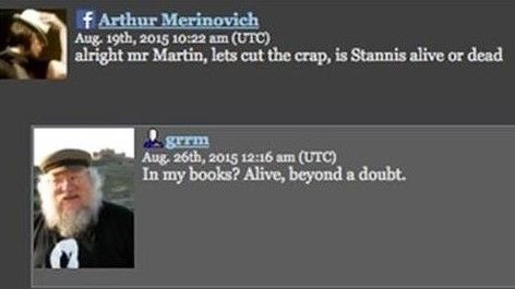 Sin embargo, George R.R. Martin asegura que Stannis Baratheon está vivo, a un aficionado de la serie que le preguntó especialmente. “¿En mis libros? Está vivo, sin duda”, respondió el autor.