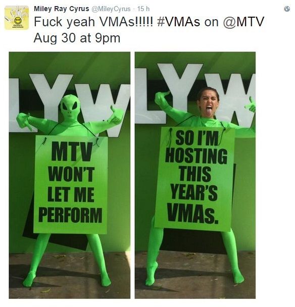 Cyrus develó su nueva tarea publicando una doble fotografía de sí misma disfrazada de alienígena con carteles en los que puede leerse “MTV no me deja actuar” y “entonces voy a presentar los VMAs de este año”, en referencia al acrónimo con el que se conocen los galardones en inglés.