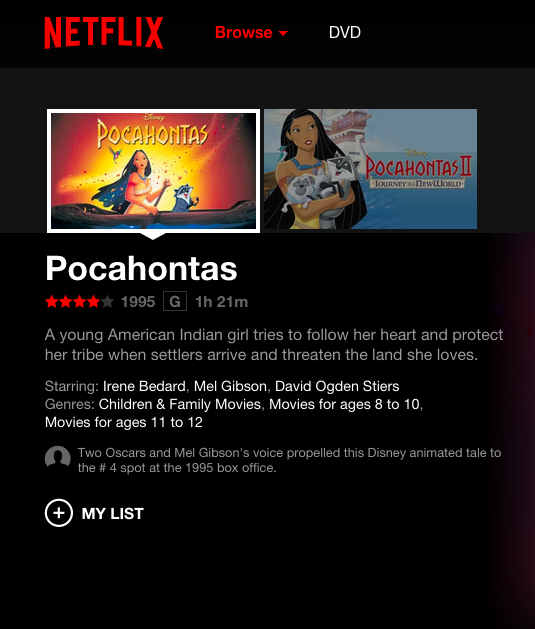 “Una mujer nativa americana se supone que tiene que casarse con el mejor guerrero del pueblo, pero ella anhela algo más. Y pronto conoce al capitán John Smith”, era el texto que mostraba Netflix.